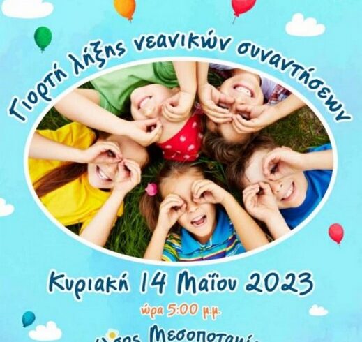 Από το Γραφείο Νεότητος της Ιεράς Μητροπόλεως Καστορίας ανακοινώνεται ότι την Κυριακή 14 Μαΐου 2023 και ώρα 5:00 μ.μ., θα πραγματοποιηθεί η καθιερωμένη γιορτή λήξης των νεανικών μας συναντήσεων, στο όμορφο άλσος της Μεσοποταμίας.