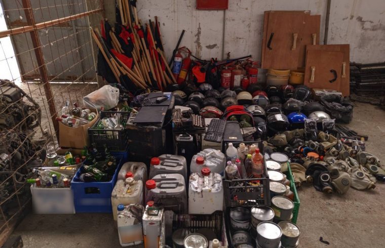 Στην επιχείρηση που πραγματοποιήθηκε πρωινές ώρες χθες (17-08-2020) και στην οποία συμμετείχαν αστυνομικοί των Διευθύνσεων Ασφαλείας, Αστυνομικών Επιχειρήσεων, Άμεσης Δράσης και Τροχαίας Θεσσαλονίκης, της Υποδιεύθυνσης Ειδικών Αστυνομικών Δυνάμεων Βορείου Ελλάδος και της Υποδιεύθυνσης Εγκληματολογικών Ερευνών Βορείου Ελλάδος, βρέθηκαν στους χώρους του κτηρίου και κατασχέθηκαν κράνη, κοντάρια, αυτοσχέδιοι εκρηκτικοί μηχανισμοί (μολότοφ), δοχεία με εύφλεκτο υλικό, μαχαίρια, ξύλινες ασπίδες, αντιασφυξιογόνες μάσκες, κροτίδες και πυροτεχνικές κατασκευές, πυροσβεστήρες, ασύρματοι, γραφομηχανή, μεγάλου μεγέθους τυπογραφική μηχανή και μηχάνημα κοπής χάρτου, πλαστή ταυτότητα, ηλεκτρονικοί υπολογιστές, χρηματικό ποσό, βιβλίο οικονομικών συνεισφορών, έντυπο υλικό κ.λ.π..