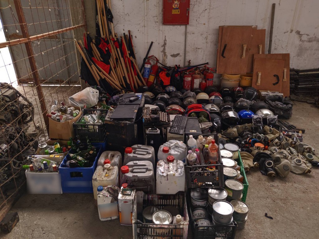 Στην επιχείρηση που πραγματοποιήθηκε πρωινές ώρες χθες (17-08-2020) και στην οποία συμμετείχαν αστυνομικοί των Διευθύνσεων Ασφαλείας, Αστυνομικών Επιχειρήσεων, Άμεσης Δράσης και Τροχαίας Θεσσαλονίκης, της Υποδιεύθυνσης Ειδικών Αστυνομικών Δυνάμεων Βορείου Ελλάδος και της Υποδιεύθυνσης Εγκληματολογικών Ερευνών Βορείου Ελλάδος, βρέθηκαν στους χώρους του κτηρίου και κατασχέθηκαν κράνη, κοντάρια, αυτοσχέδιοι εκρηκτικοί μηχανισμοί (μολότοφ), δοχεία με εύφλεκτο υλικό, μαχαίρια, ξύλινες ασπίδες, αντιασφυξιογόνες μάσκες, κροτίδες και πυροτεχνικές κατασκευές, πυροσβεστήρες, ασύρματοι, γραφομηχανή, μεγάλου μεγέθους τυπογραφική μηχανή και μηχάνημα κοπής χάρτου, πλαστή ταυτότητα, ηλεκτρονικοί υπολογιστές, χρηματικό ποσό, βιβλίο οικονομικών συνεισφορών, έντυπο υλικό κ.λ.π..