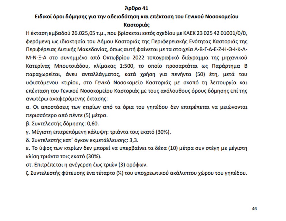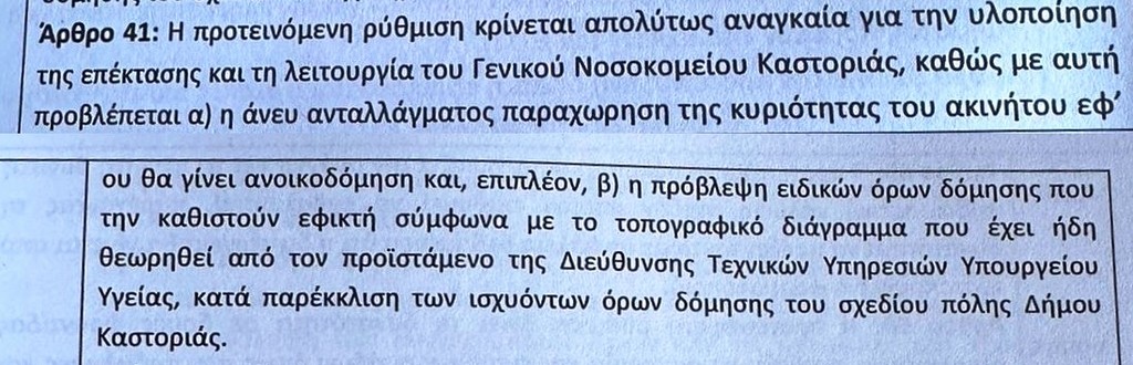 Έπειτα από συντονισμένες προσπάθειες της Βουλευτού Καστοριάς Μαρίας Αντωνίου, που περιελάμβαναν σειρά συναντήσεων εργασίας με όλους τους αρμόδιους κυβερνητικούς παράγοντες και τους εμπλεκόμενους φορείς της Καστοριάς, εισήχθη στο Σχέδιο Νόμου του Υπουργείου Υγείας «Δράσεις Δημόσιας Υγείας, Ρυθμίσεις για την ενίσχυση του Εθνικού Συστήματος Υγείας», ειδική νομοθετική ρύθμιση, με θέμα «Ειδικοί όροι δόμησης και επέκταση του Γενικού Νοσοκομείου Καστοριάς».