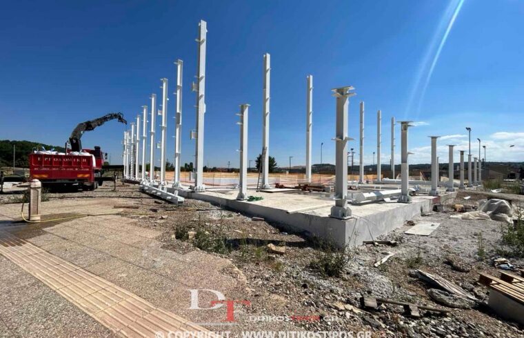 Ήδη τοποθετήθηκαν οι κολώνες στις οποίες θα τοποθετηθεί το κέλυφος του κολυμβητηρίου, του οποίου πλέον ορατή είναι και η κολυμβητική δεξαμενή που έχει χαρακτηριστικά 25 μ. x 15 μ. και δυο μέτρα βάθος.