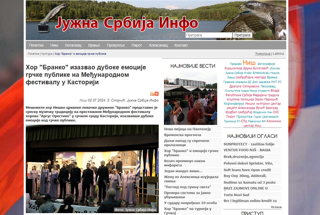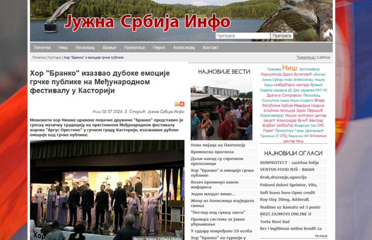 Εκτενές δημοσίευμα για το επιτυχημένο 22ο Διεθνές Χορωδιακό Φεστιβάλ που πραγματοποιήθηκε το τριήμερο 28 με 30 Ιουνίου 2024, στο Άργος Ορεστικό, δημοσιεύτηκε από Σέρβο δημοσιογράφο σε ΜΜΕ της Σερβίας, της οποίας τιμώμενη Χορωδία για φέτος ήταν η Church Choral Society “Branko” από την πόλη Nis.