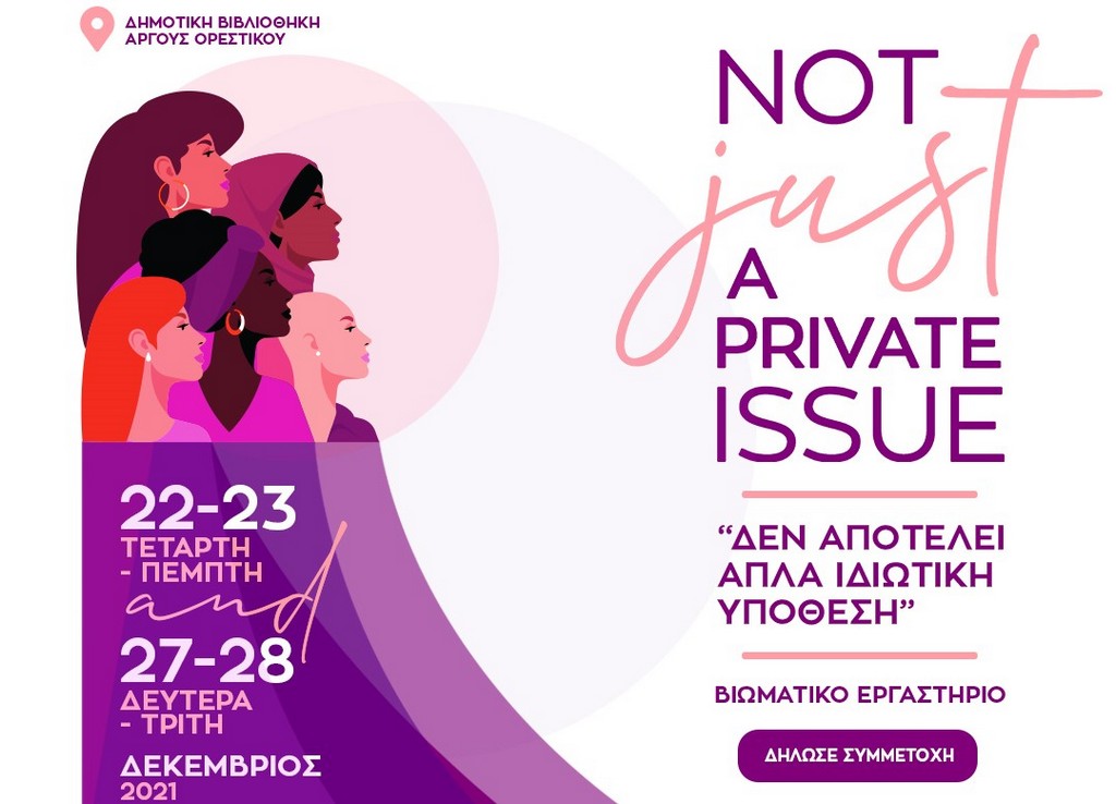 Τετραήμερο βιωματικό εργαστήριο “Δεν αποτελεί απλά ιδιωτική υπόθεση” με κεντρικό θέμα την έμφυλη βία και τη δημιουργία υποστηρικτικών δικτύων θα πραγματοποιηθεί στη Δημοτική Βιβλιοθήκη Άργους Ορεστικού τις ημέρες Τετάρτη 22, Πέμπτη 23, Δευτέρα 27 και Τρίτη 28 Δεκέμβρη και ώρες 9.30π.μ- 13.30 μ.μ.