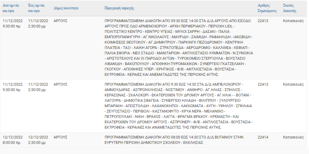 Χωρίς ρεύμα για αρκετές ώρες θα βρεθεί σχεδόν όλο το Άργος Ορεστικό και αρκετά χωριά του δήμου την Κυριακή 11 Δεκεμβρίου 2022 λόγω προγραμματισμένων διακοπών από τον ΔΕΔΔΗΕ.