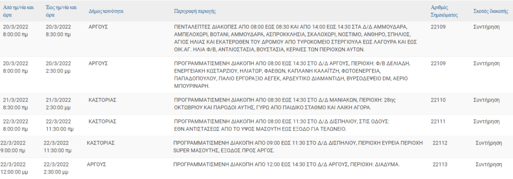 ΔΕΔΔΗΕ: Διακοπές ρεύματος σε Άργος και Καστοριά την Κυριακή, Δευτέρα και Τρίτη 20-21-22/03