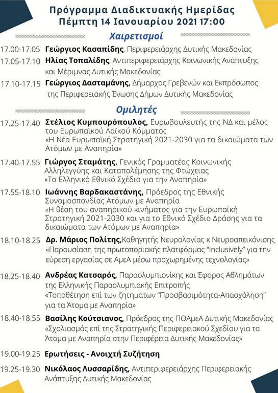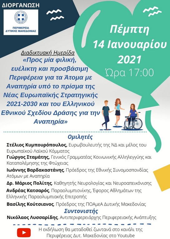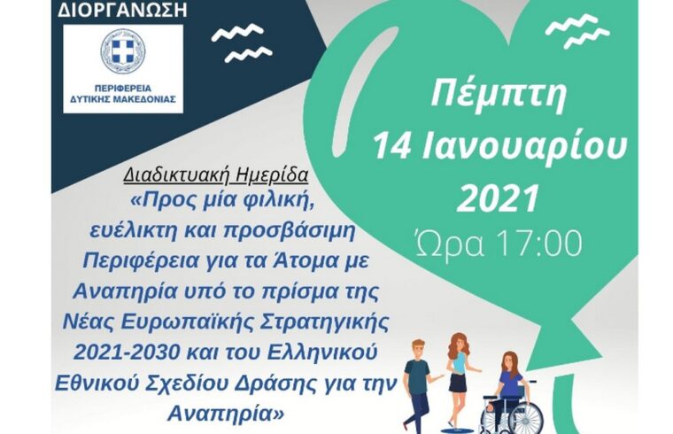Με τη Νέα Ευρωπαϊκή Στρατηγική 2021-2030 για τα δικαιώματα των ανάπηρων ατόμων και το Ελληνικό Εθνικό Σχέδιο Δράσης για την Αναπηρία να βρίσκονται προ των πυλών, διοργανώνεται από την Περιφέρεια Δυτικής Μακεδονίας μία διαδικτυακή Ημερίδα με σκοπό την διάρθρωση Στρατηγικής Περιφερειακού Σχεδίου για τα Άτομα με Αναπηρία.