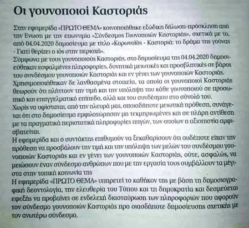 Με δικαίωση και ικανοποίηση η Διοίκηση του Συνδέσμου Γουνοποιών Καστοριάς, τα Μέλη της, οι Γουνοποιοί Καστοριάς – Σιάτιστας και όλοι φορείς του κλάδου που τους εκπροσωπούν, υποδέχτηκαν το απαντητικό δημοσίευμα της Εφημερίδας «Πρώτο Θέμα» στην εξώδικη δήλωση – πρόσκληση που είχε κατατεθεί τις 4-4-2020, για τη διάχυση μη έγκυρων πληροφοριών περί της διάδοσης του ιού COVID -19 στον Νομό Καστοριάς. Πληροφορίες, οι οποίες έπλητταν το ήθος και την επαγγελματική ακεραιότητα του κλάδου, καθιστώντας τον εσφαλμένως εξιλαστήριο θύμα, σε μία κρίσιμη περίοδο για τον παγκόσμιο χάρτη. Η δημιουργία αόρατων εχθρών και τεχνητών θυμάτων σε αυτήν την κρίσιμη περίοδο, δεν επιλύει προβλήματα, αντιθέτως πολλαπλασιάζει τα υπάρχοντα και αποπροσανατολίζει την γνώμη της Τοπικής Κοινωνίας.
