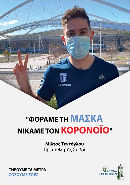 Με κεντρικό σύνθημα «Φοράμε τη Μάσκα, Νικάμε τον Κορονοϊό», ο κορυφαίος Γρεβενιώτης Πρωταθλητής Στίβου κ.Μίλτος Τεντόγλου στέλνει, μέσα από την νέα ενημερωτική αφίσα του Δήμου Γρεβενών, το δικό του ξεχωριστό μήνυμα για την αντιμετώπιση της πανδημίας Covid-19, υπενθυμίζοντας την υποχρεωτική χρήση της μάσκας για την αποτελεσματική τιθάσευση της επικίνδυνης λοίμωξης.