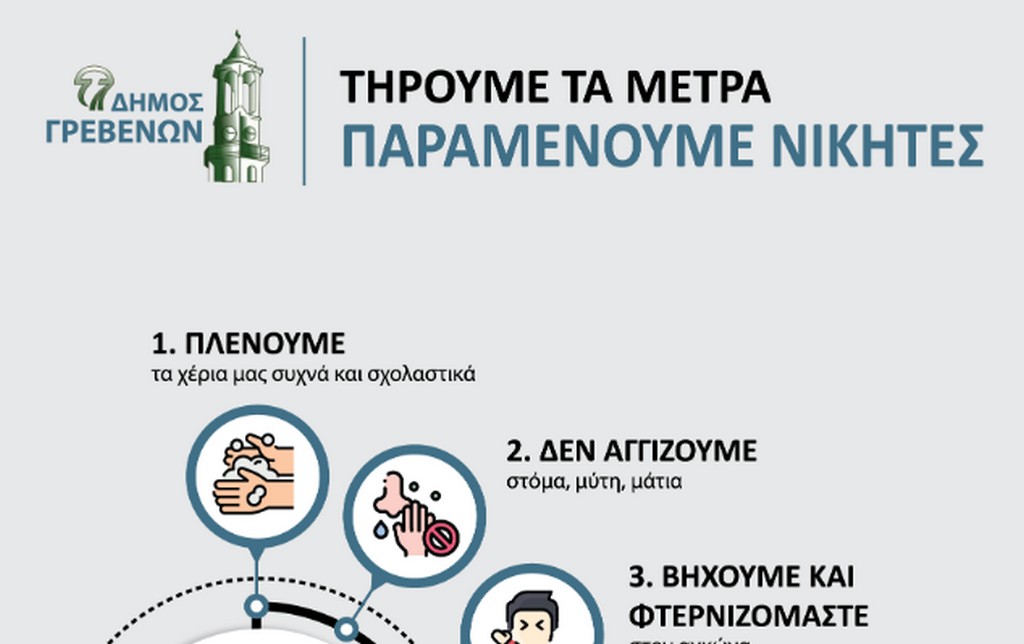 Στο πλαίσιο της κοινωνικής ευθύνης και με κεντρικό σύνθημα “Τηρούμε τα Μέτρα – Παραμένουμε Νικητές”, o Δήμος Γρεβενών, σε μια προσπάθεια συνεχούς και αδιάλειπτης πληροφόρησης των πολιτών για τον κίνδυνο εξάπλωσης του Κορωνοϊού, που συνεχίζει να ελλοχεύει και στη Δυτική Μακεδονία καθώς καταγράφεται επανεμφάνιση της πανδημίας, προχωρά στη σχεδίαση και εκτύπωση ενημερωτικής αφίσας η οποία θα μας υπενθυμίζει ότι δεν υπάρχει κανένα περιθώριο εφησυχασμού καθώς το πρώτο κύμα της νόσου είναι ακόμη σε εξέλιξη.