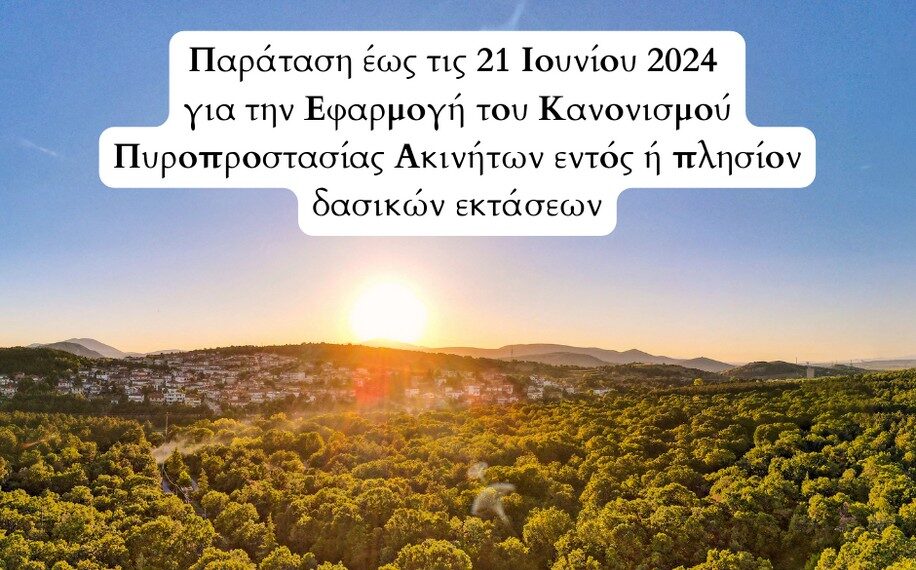 Δημοσιεύτηκε στην Εφημερίδα της Κυβερνήσεως η Κοινή Απόφαση των Υπουργών Περιβάλλοντος και Ενέργειας, Κλιματικής Κρίσης και Πολιτικής Προστασίας και Εσωτερικών, με την οποία παρατείνεται έως τις 21 Ιουνίου η προθεσμία εφαρμογής του «Κανονισμού Πυροπροστασίας Ακινήτων εντός ή πλησίον δασικών εκτάσεων».