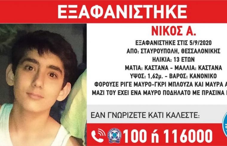 Συναγερμό στις αρχές και ενεργοποίηση του #missing alert από το Χαμόγελο του Παιδιού για ένα αγόρι 13 ετών τα ίχνη του οποίου χάθηκαν το Σάββατο στην Σταυρούπολη της Θεσσαλονικής.