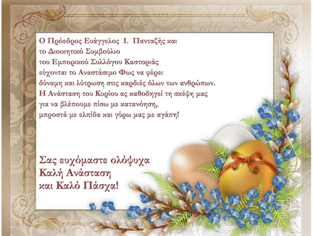 Ο Πρόεδρος Ευάγγελος Ι. Πανταζής και το Διοικητικό Συμβούλιο του Εμπορικού Συλλόγου Καστοριάς, εύχονται το Αναστάσιμο Φως να φέρει δύναμη και λύτρωση στις καρδιές όλων των ανθρώπων.