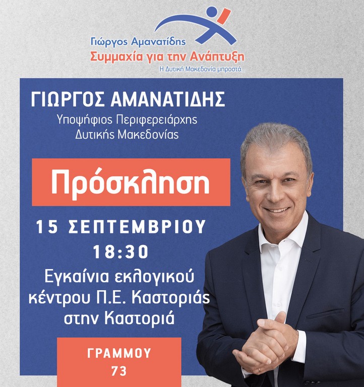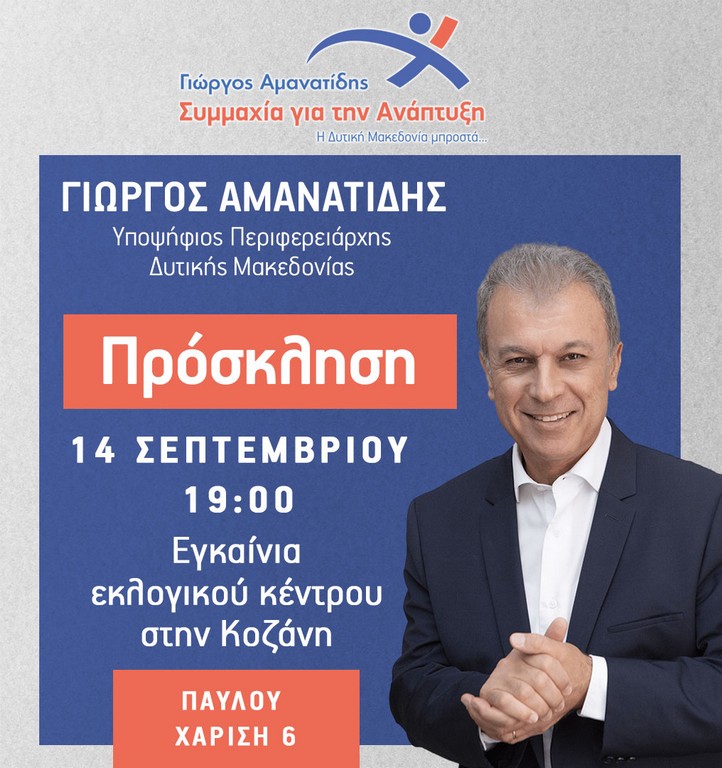 Για το διήμερο Πέμπτη 14 και Παρασκευή 15 Σεπτεμβρίου, είναι προγραμματισμένα αντίστοιχα σε Κοζάνη και Καστοριά τα εγκαίνια των εκλογικών κέντρων του συνδυασμού “Συμμαχία για την Ανάπτυξη”. Θα ακολουθήσουν την επόμενη εβδομάδα σε Φλώρινα και Γρεβενά.