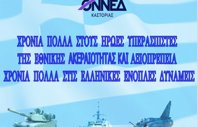Σήμερα ημέρα τιμής προς της ένοπλες δυνάμεις της χώρας μας θέλουμε ως νομαρχιακή επιτροπή της ΟΝΝΕΔ Καστοριάς να τους ευχηθούμε Χρόνια πολλά και να είναι πάντα δυνατοί ώστε να υπερασπίζονται τα δίκαια της πατρίδος μας.