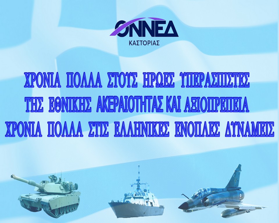 Σήμερα ημέρα τιμής προς της ένοπλες δυνάμεις της χώρας μας θέλουμε ως νομαρχιακή επιτροπή της ΟΝΝΕΔ Καστοριάς να τους ευχηθούμε Χρόνια πολλά και να είναι πάντα δυνατοί ώστε να υπερασπίζονται τα δίκαια της πατρίδος μας.