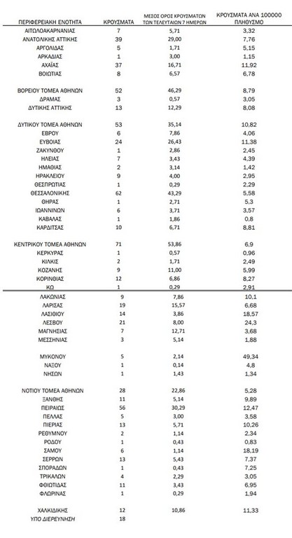 Σύμφωνα με τον ΕΟΔΥ τα νέα κρούσματα καταγράφονται ως εξής: