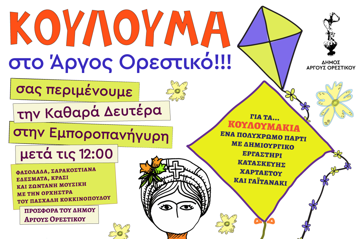 Tην Καθαρά Δευτέρα, σας περιμένουμε στο χώρο της Εμποροπανήγυρης μετά τις 12:00, για να γιορτάσουμε μαζί με παραδοσιακή φασολάδα, σαρακοστιανά εδέσματα, κρασί και ζωντανή μουσική από την ορχήστρα του Πασχάλη Κοκκινόπουλου, προσφορά του Δήμου Άργους Ορεστικού!