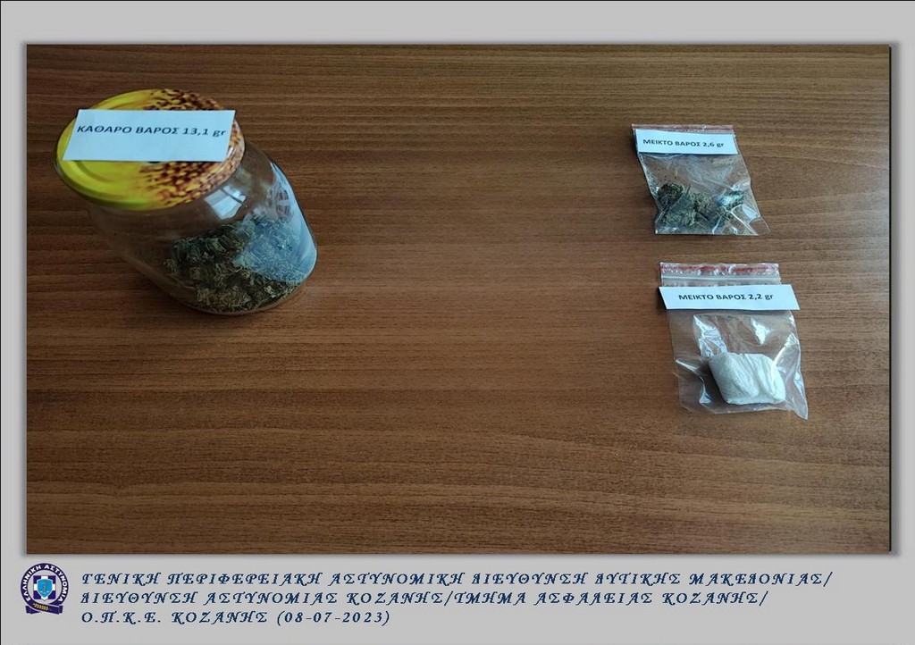 Συνελήφθη την Παρασκευή 07 Ιουλίου 2023 το βράδυ σε περιοχή της Κοζάνης, από αστυνομικούς του Τμήματος Ασφάλειας Κοζάνης, 39χρονος ημεδαπός, διότι σε έλεγχο που πραγματοποιήθηκε βρέθηκαν και κατασχέθηκαν -17,9- γραμμάρια ακατέργαστης κάνναβης.
