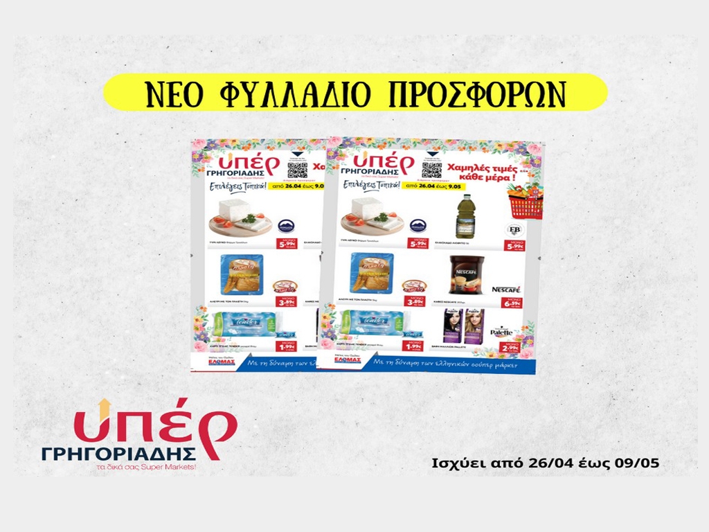 Δείτε όλες τις νέες τεράστιες προσφορές του φυλλαδίου που είναι σε ισχύ από 26 Απριλίου έως και 9 Μαΐου από τα Σούπερ Μάρκετ ΥΠΕΡ Γρηγοριάδη!!!