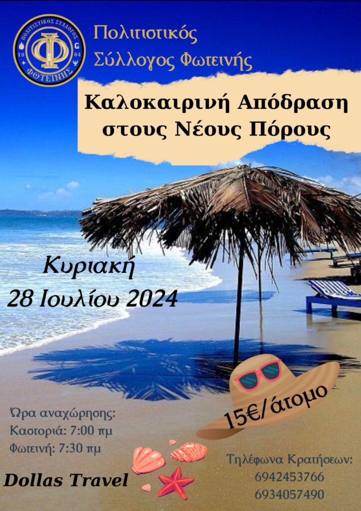 Ο Πολιτιστικός Σύλλογος Φωτεινής σε συνεργασία με το Dollas Travel διοργανώνει την τέλεια ημερήσια απόδραση του φετινού καλοκαιριού σε μια τεράστια καθαρή και αμμουδερή παραλία, στους Νέους Πόρους Κατερίνης, την Κυριακή 28 Ιουλίου 2024.