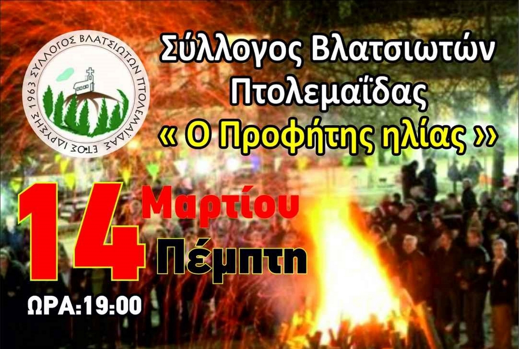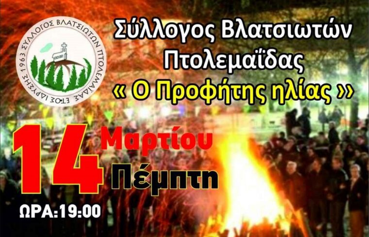 Το άναμμα της κλαδαριάς του Συλλόγου Βλατσιωτών Πτολεμαΐδας “Ο Προφήτης Ηλίας” θα πραγματοποιηθεί την Πέμπτη στις 19.00 στη συμβολή των οδών Μακεδονομάχων και Λαγοθηριανού (περιοχή κλινικής Ζέρβα), με την παραδοσιακή ορχήστρα “Παραδοσιακό Σεργιάνι”.