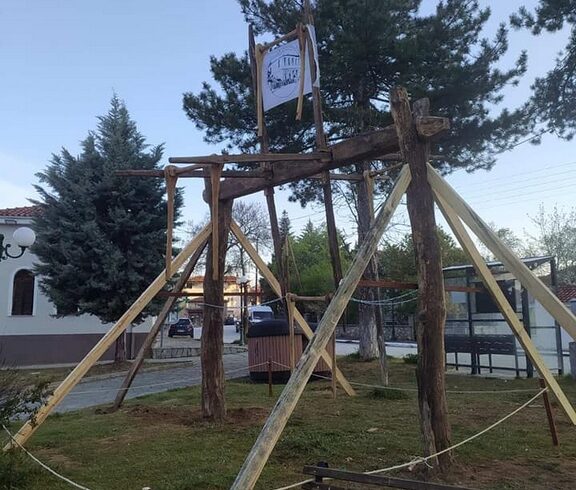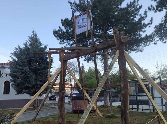 Ολοκληρώθηκε το στήσιμο της παραδοσιακής ξύλινης ρόδας που κάθε φορά έπαιρνε θέση στην πλατεία του Κωσταραζίου κατά τον τριήμερο εορτασμό του Πάσχα.