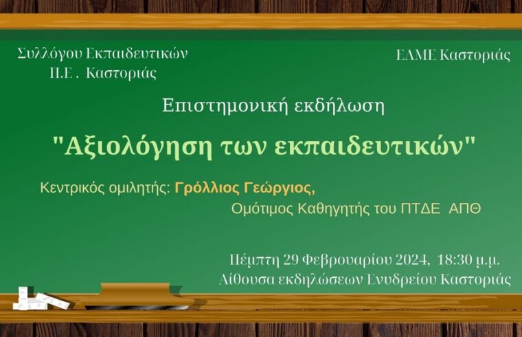 Ο Σύλλογος Εκπαιδευτικών Α/θμιας Εκπ/σης Ν.Καστοριάς συνδιοργανώνει με την ΕΛΜΕ Καστοριάς επιστημονική εκδήλωση με θέμα: «Αξιολόγηση των εκπαιδευτικών» την Πέμπτη 29 Φεβρουαρίου 2024 και ώρα 18:30 στην αίθουσα εκδηλώσεων στον χώρο του ΚΠΕ – Ενυδρείου Καστοριάς με κεντρικό ομιλητή τον Ομότιμο Καθηγητή του Παιδαγωγικού Τμήματος Δημοτικής Εκπαίδευσης του Αριστοτελείου Πανεπιστημίου Θεσσαλονίκης, κύριο Γεώργιο Γρόλλιο.
