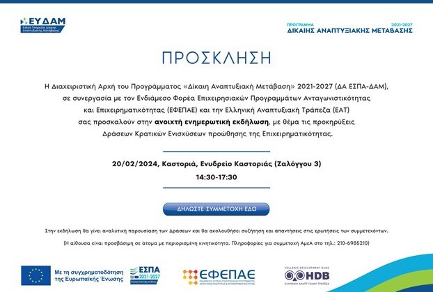 Η Διαχειριστική Αρχή του Προγράμματος «Δίκαιη Αναπτυξιακή Μετάβαση» 2021-2027 (ΔΑ ΕΣΠΑ-ΔΑΜ), σε συνεργασία με τον Ενδιάμεσο Φορέα Επιχειρησιακών Προγραμμάτων Ανταγωνιστικότητας και Επιχειρηματικότητας (ΕΦΕΠΑΕ) και την Ελληνική Αναπτυξιακή Τράπεζα (ΕΑΤ) σας προσκαλούν στην ανοιχτή ενημερωτική εκδήλωση, με θέμα τις προκηρύξεις Δράσεων Κρατικών Ενισχύσεων προώθησης της Επιχειρηματικότητας.