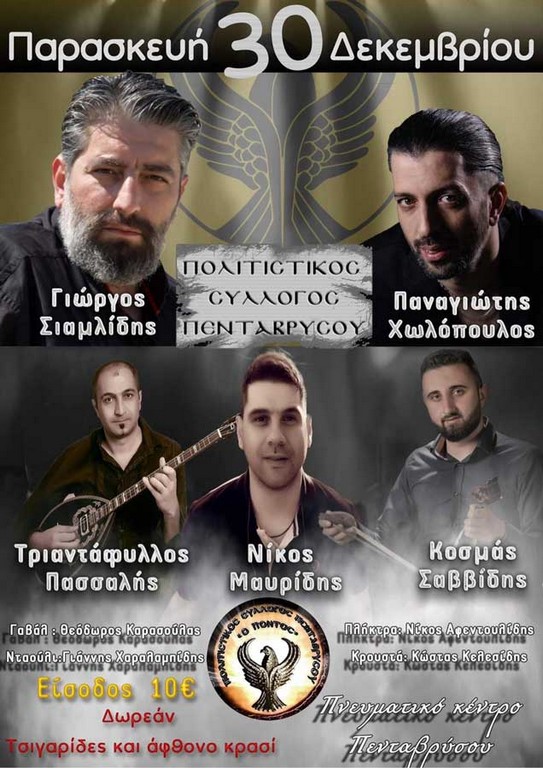 Ο Πολιτιστικός Σύλλογος Πενταβρύσου «Ο ΠΟΝΤΟΣ» σας προσκαλεί στην ετήσια Γουρουνοχαρά που θα πραγματοποιηθεί την Παρασκευή 30 Δεκεμβρίου στο Πνευματικό Κέντρο Πενταβρύσου.