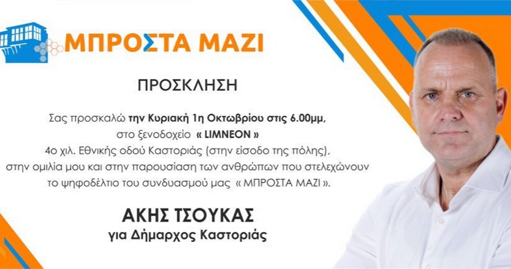 Σας προσκαλώ την Κυριακή 1 Οκτωβρίου 2023 στις 06:00 μ.μ., στο ξενοδοχείο “LIMNEON”, 4ο χλμ. Εθνικής οδού Καστοριά (στην είσοδο της πόλης), στην ομιλία μου και στην παρουσίαση των ανθρώπων που στελεχώνουν το ψηφοδέλτιο του συνδυασμού μας «ΜΠΡΟΣΤΑ ΜΑΖΙ».