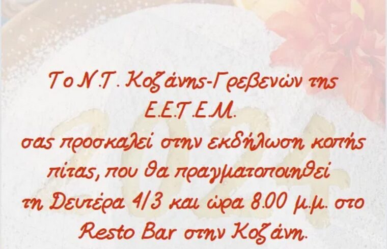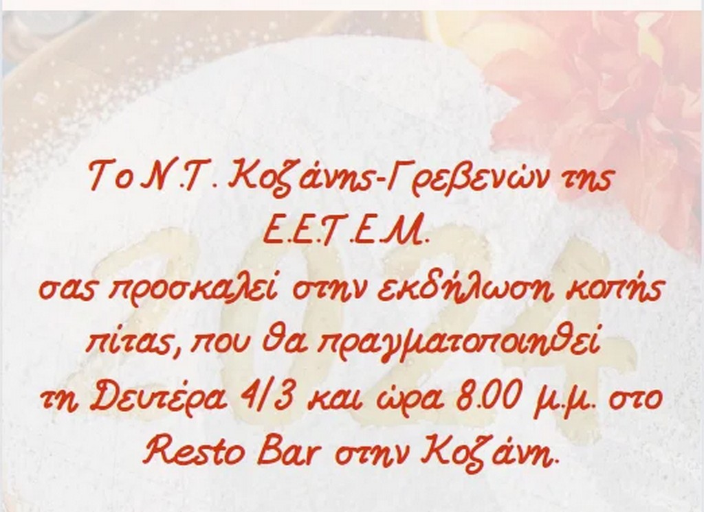 Το Ν.Τ. Κοζάνης-Γρεβενών της Ε.Ε.Τ.Ε..Μ. σας προσκαλεί στην εκδήλωση κοπής πίτας, που θα πραγματοποιηθεί τη Δευτέρα 4/3 και ώρα 8.00 μ.μ. στο Resto Bar στην Κοζάνη.