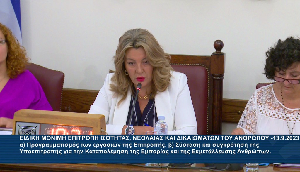 Υπό την Προεδρία της Μαρίας Αντωνίου ολοκληρώθηκαν πριν από λίγο οι εργασίες της πρώτης συνεδρίαση της Ειδικής Μόνιμης Επιτροπής Ισότητας Νεολαίας και Δικαιωμάτων του Ανθρώπου με θέματα ημερήσιας διάταξης: α) Προγραμματισμός των εργασιών της Επιτροπής και β) Σύσταση και συγκρότηση της Υποεπιτροπής για την Καταπολέμηση της Εμπορίας και της Εκμετάλλευσης των Ανθρώπων.