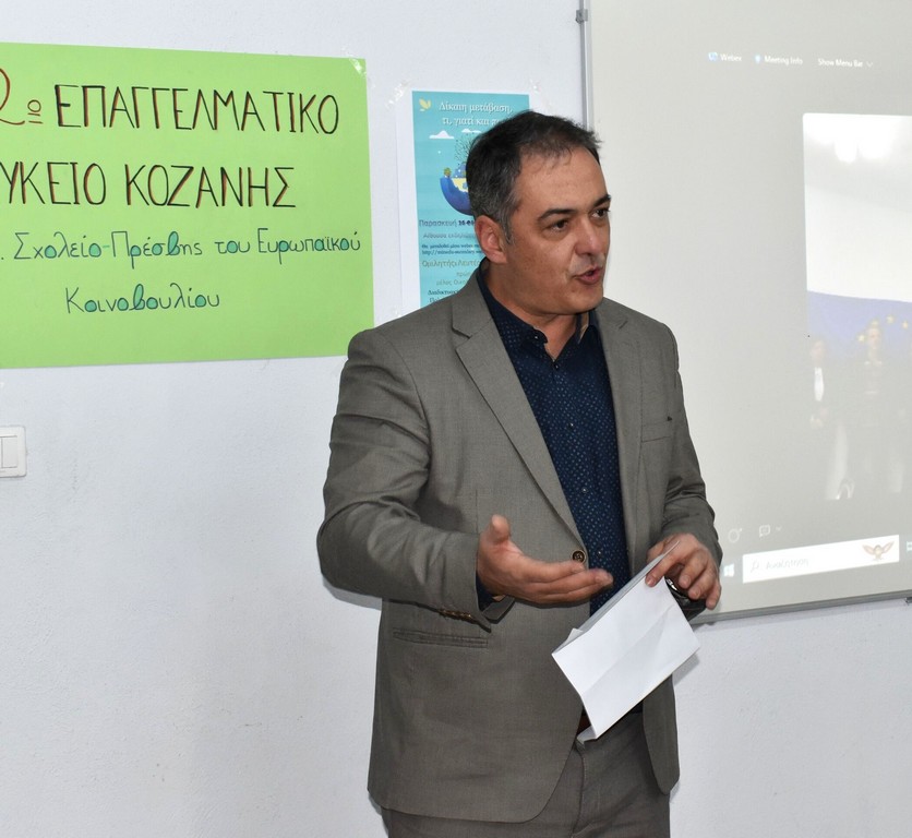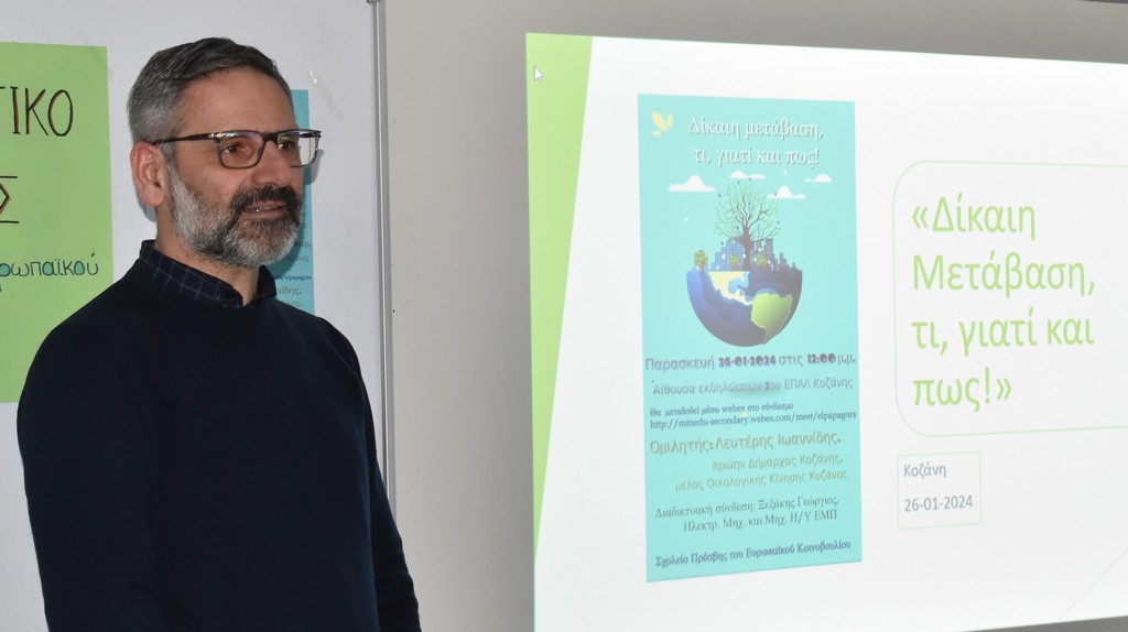 Σε ενημερωτική εκδήλωση του 2ου ΕΠΑΛ Κοζάνης με τίτλο «Δίκαιη Μετάβαση, τι, γιατί και πως!» και κεντρικό ομιλητή τον πρώην Δήμαρχο Κοζάνης και μέλος της Οικολογικής Κίνησης Λευτέρη Ιωαννίδη, παρέστη το μεσημέρι της Παρασκευής 26 Ιανουαρίου 2024, ο Δήμαρχος Κοζάνης Γιάννης Κοκκαλιάρης.