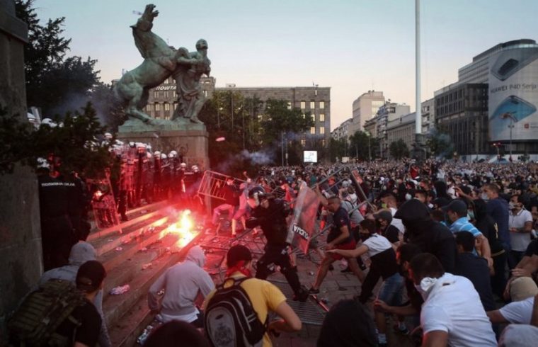Πολιτική αναταραχή και επεισόδια έχει προκαλέσει η αύξηση των κρουσμάτων κορωνοϊού στη Σερβία τις τελευταίες μέρες. Εχθές πραγματοποιήθηκαν νέες συγκεντρώσεις και επεισόδια στο Βελιγράδι και άλλες πόλεις, με αιτήματα που αφορούν σε αλλαγές στην αντιμετώπιση της πανδημίας από την πολιτική ηγεσία. Ισχυρές δυνάμεις της αστυνομίας διέλυσαν το βράδυ της Τετάρτης την συγκέντρωση που διοργάνωσε η αντιπολίτευση μπροστά από την Βουλή. Τα επεισόδια ξεκίνησαν όταν ομάδα διαδηλωτών αφαίρεσε τα μεταλλικά κιγκλιδώματα που περιβάλουν το κτήριο και κατευθύνθηκαν προς την είσοδο πετώντας πέτρες και κροτίδες εναντίον των αστυνομικών.