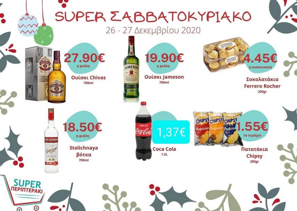 Μήπως ξεχάσατε ότι τα καταστήματα υγειονομικού ενδιαφέροντος είναι κλειστά και ξεχάσατε να προμηθευτείε το αγαπημένο σας ποτό για να το απολαύσετε με την οικογένεια σας αυτές τις γιορτινές μέρες; Κανένα πρόβλημα…. Το SUPER ΠΕΡΙΠΤΕΡΑΚΙ είναι εδώ και πάλι αυτό το εορταστικό Χριστουγεννιάτικο Σαββατοκύριακο να καλύψει και αυτήν την ανάγκη με 6 δυνατές προσφορές!
