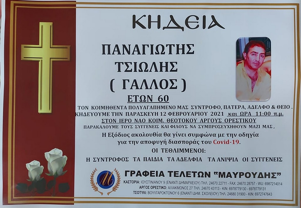 Σύμφωνα με πληροφορίες, ο θάνατος του αποδίδεται σε φυσικά αίτια. Η κηδεία του θα πραγματοποιηθεί αύριο Παρασκευή 12 Φεβρουαρίου στις 11.00 το πρωί στον Ιερό Ναό Κοιμήσεως Θεοτόκου Άργους Ορεστικού, σύμφωνα με τα μέτρα κατά του κορωνοϊού.