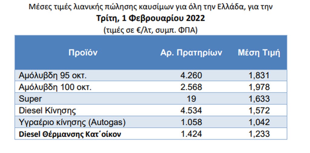Σύμφωνα με το Παρατηρητήριο Τιμών του υπουργείου Ανάπτυξης η μέση τιμή σήμερα αγγίζει τα 1,831 ευρώ πανελλαδικά για την 95 οκτανίων, τα 1,978 για την αμόλυβδη 100 οκτανίων 1,978, η τιμή της σούπερ διαμορφώνεται στα 1,633 ευρώ, diesel κίνησης στα 1,572 και το υγραέριο κίνησης στα 1,042.