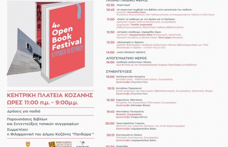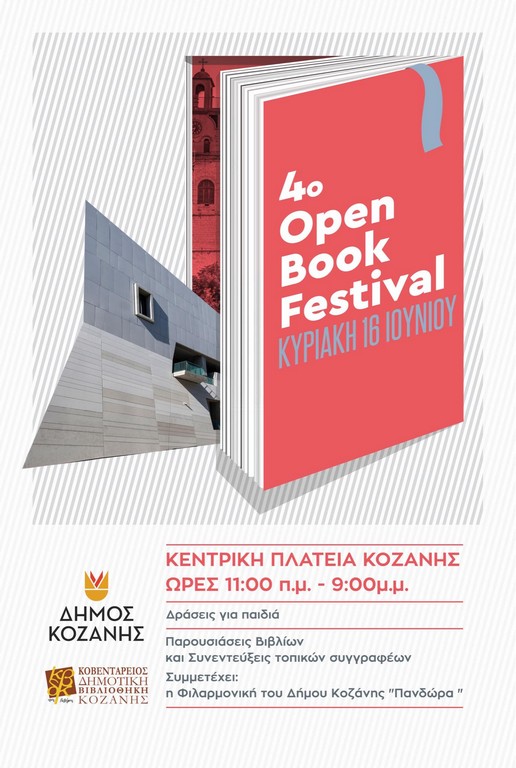 Με επίκεντρο και άξονα τον μαγικό κόσμο του βιβλίου, ο Δήμος Κοζάνης σας προσκαλεί στο 4ο Open Book Festival, το οποίο θα λάβει χώρα αυτή την Κυριακή 16 Ιουνίου 2024 στην κεντρική πλατεία Νίκης της Κοζάνης, με πολλές και ποικίλες δράσεις από το πρωί έως το βράδυ.