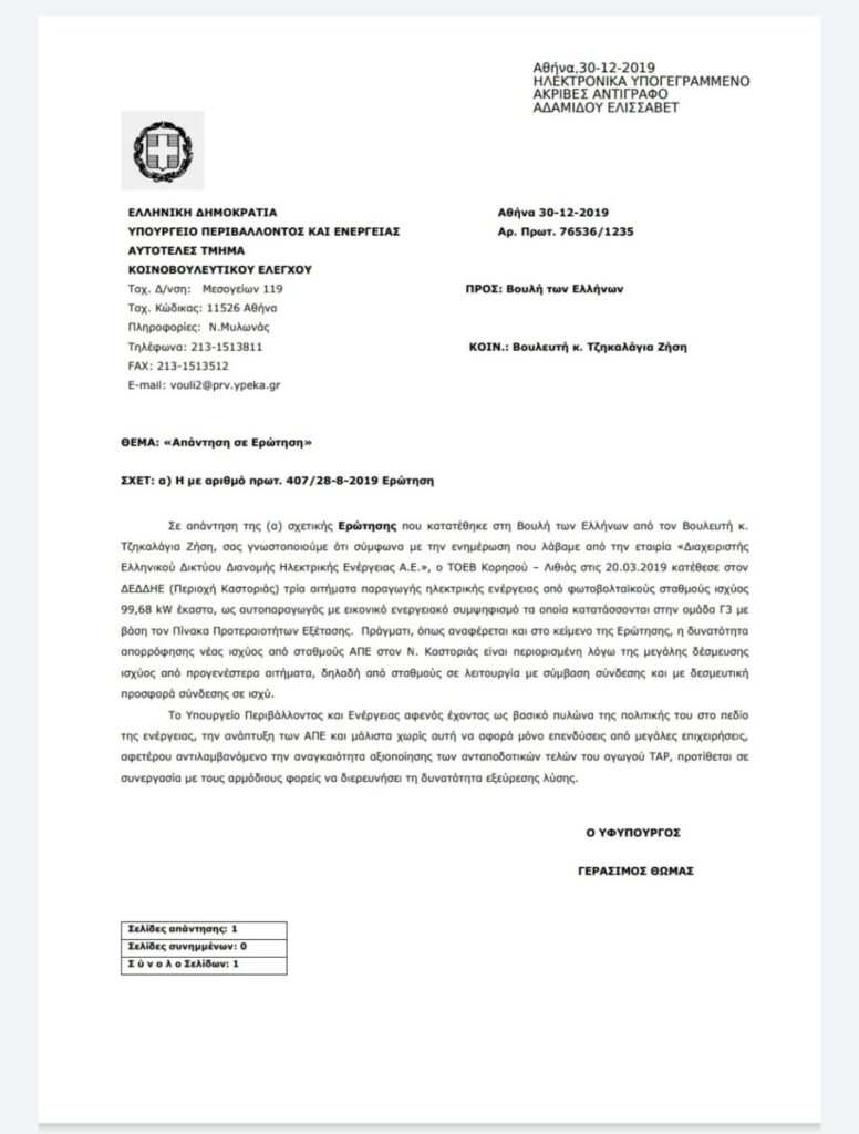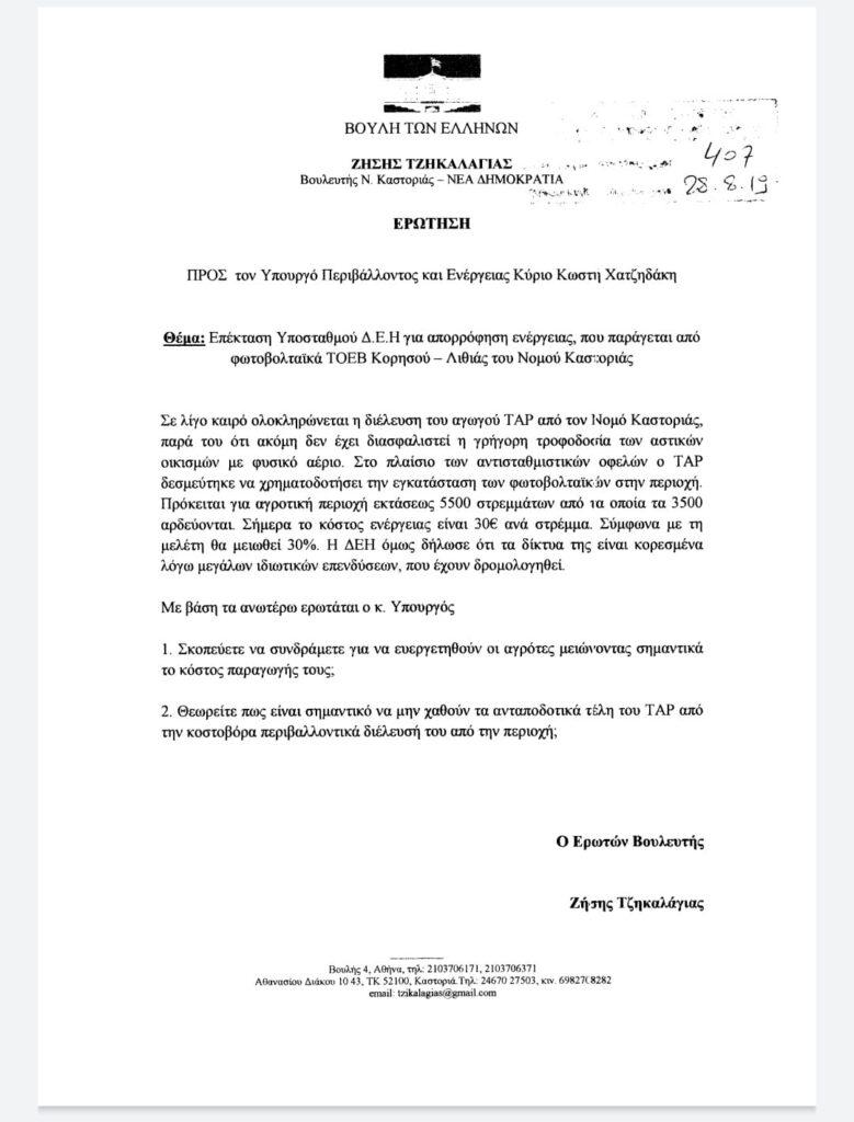 •Αρχικά ,με αφορμή την κατασκευή φωτοβολταϊκών ,του ΤΟΕΒ-ΚΟΡΗΣΟΥ-ΛΙΘΙΑΣ ως ανταποδοτική από την διέλευση του αγωγού TAP, προχώρησα σε κοινοβουλευτική ερώτηση προς τον αρμόδιο Υπουργό κ.Κωστή Χατζηδάκη.